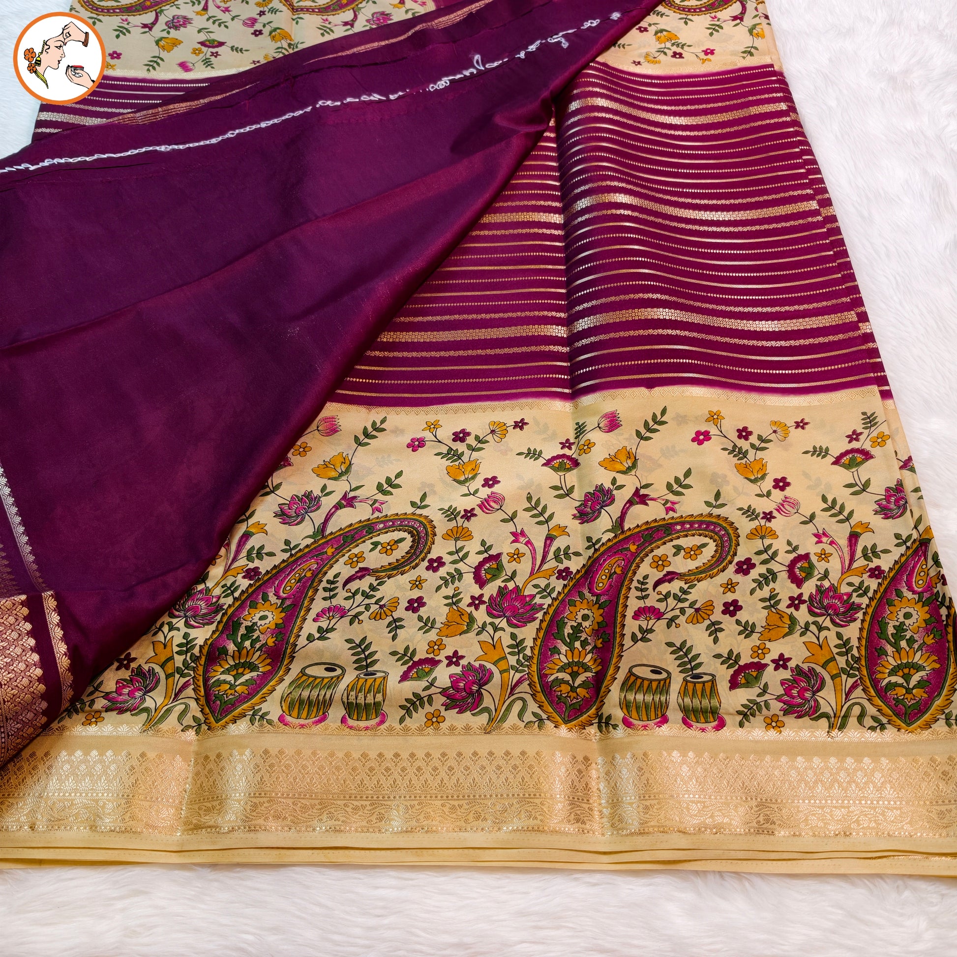 Elevate your wardrobe with this exquisite Cream & Purple designer semi Mysore silk saree—a masterpiece that seamlessly blends timeless elegance with contemporary sophistication. Crafted from premium semi Mysore silk, this saree drapes with a luxurious fluidity that flatters every silhouette. The refined cream and purple palette exudes understated luxury, making it an ideal choice for weddings, celebrations, and refined occasions.