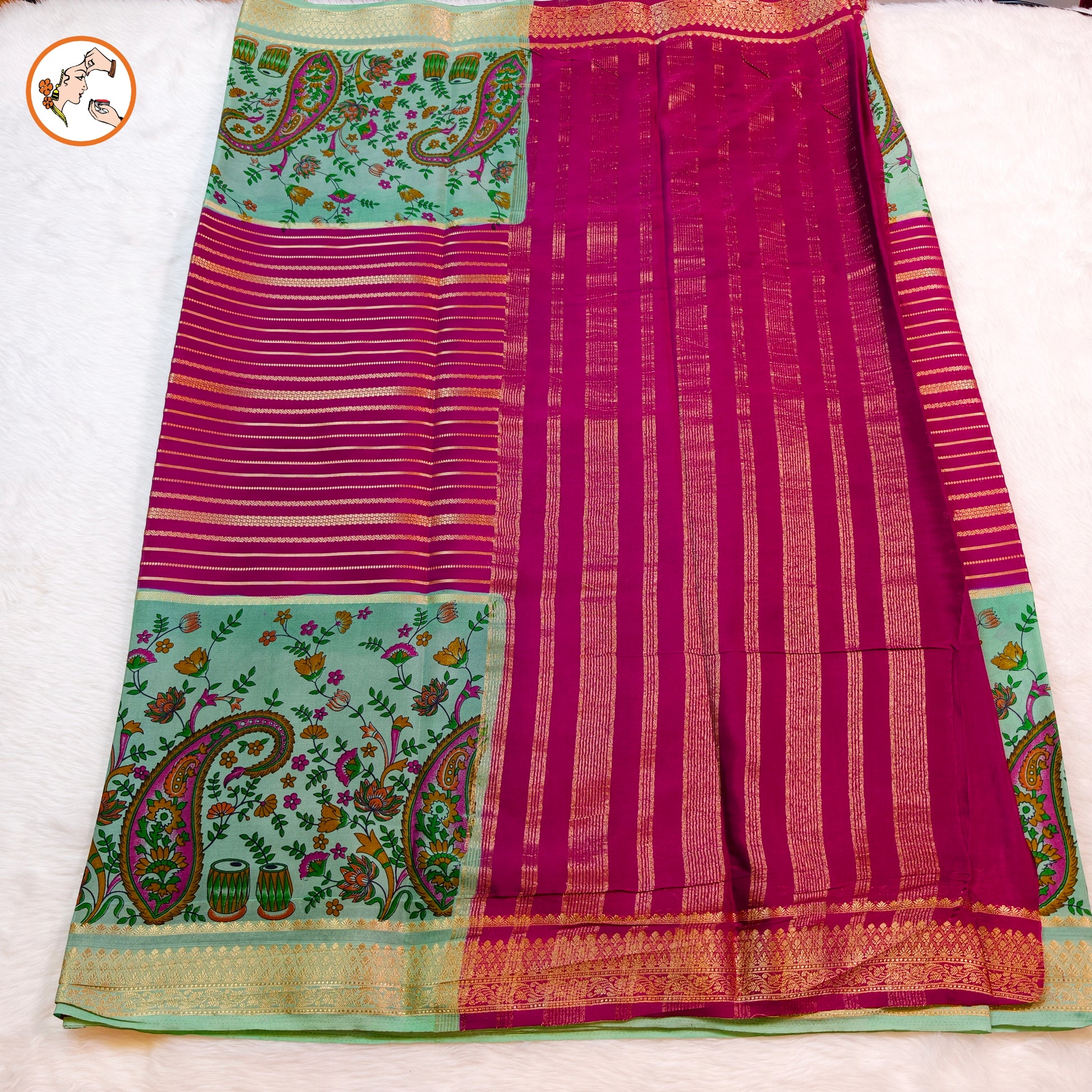 This exquisite semi Mysore silk saree marries timeless elegance with contemporary design sensibility. The striking interplay of rich purple and soft pista green creates a sophisticated palette that transcends seasonal trends.Mysore silk's lustrous finish and fluid drape enhance the saree's inherent grace, while the designer detailing elevates it beyond everyday wear. Perfect for weddings, celebrations, and formal occasions where refined beauty speaks louder than embellishment.