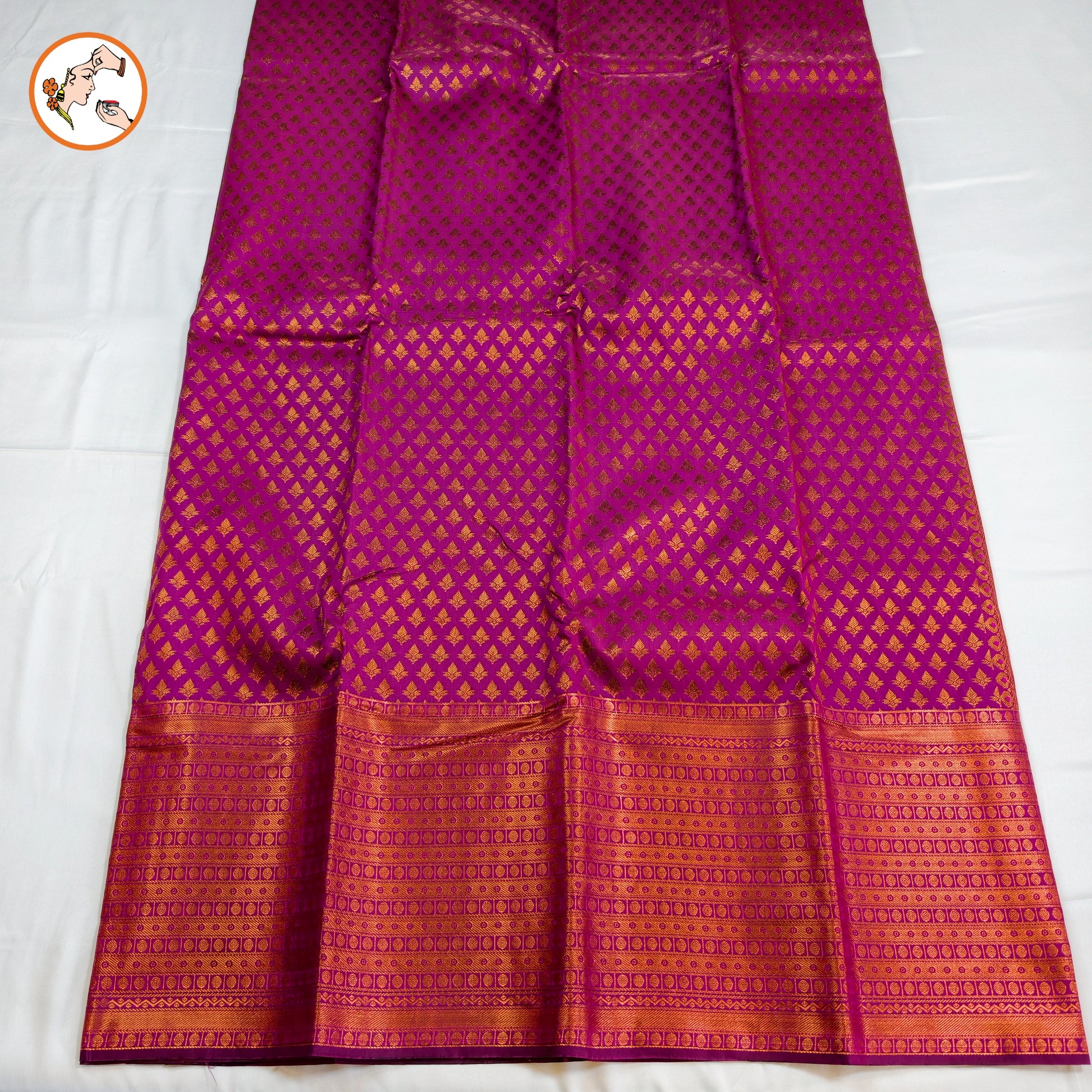 This purple silk saree showcases the intricate 1000 butta motif—a hallmark of authentic South Indian craftsmanship. The rich, jewel-toned purple is complemented by traditional gold zari work that catches light with every movement, making it an ideal choice for weddings and formal celebrations.