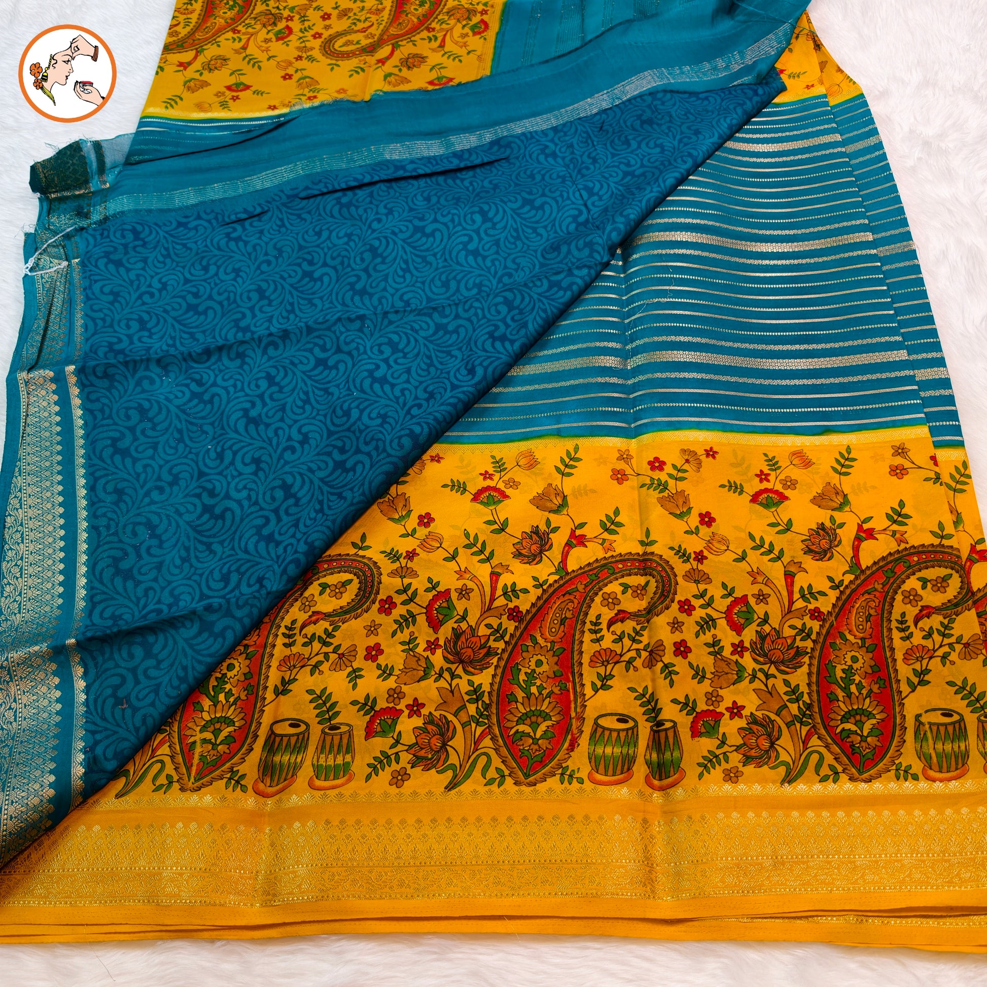 Yellow & Peacock Blue designer semi Mysore Silk Saree