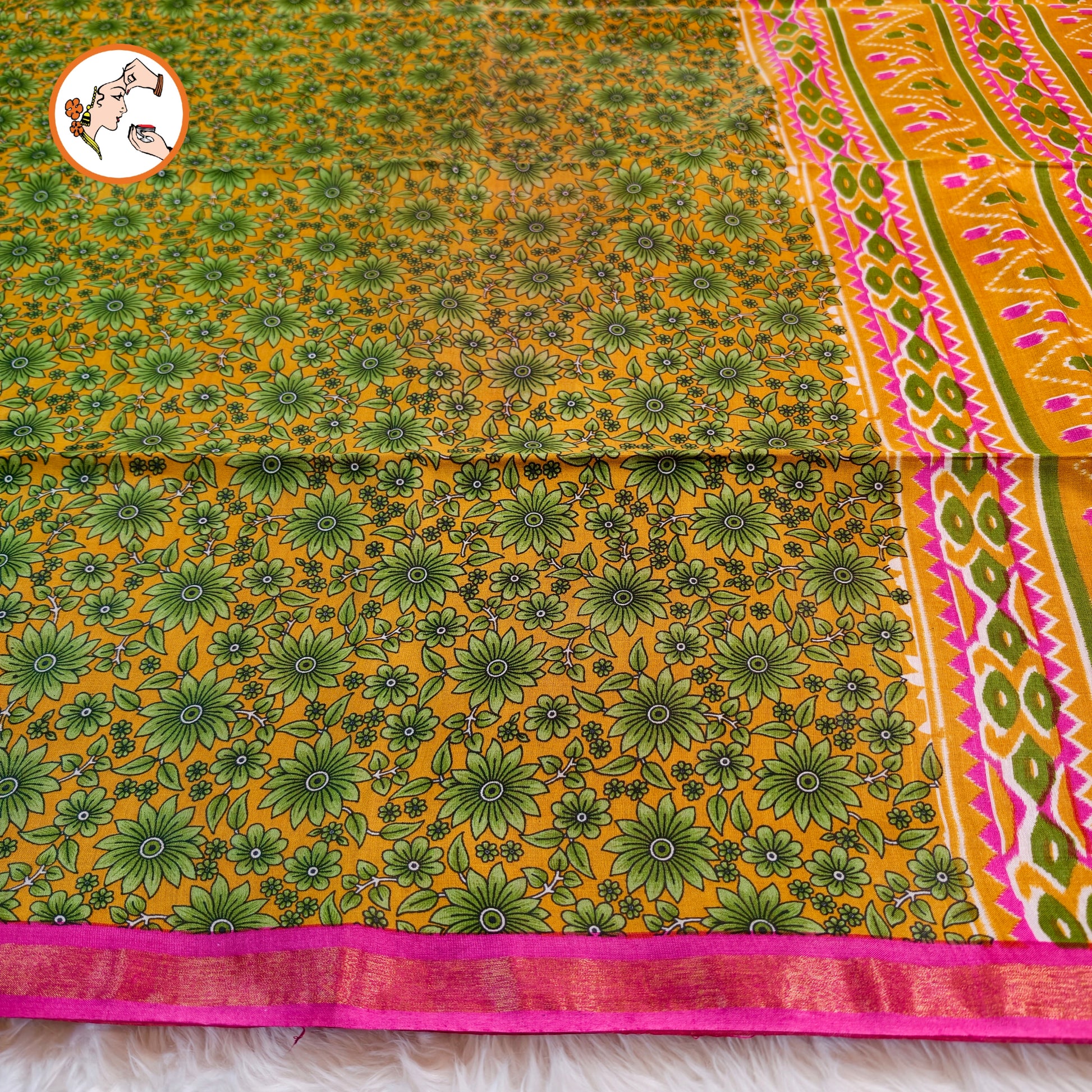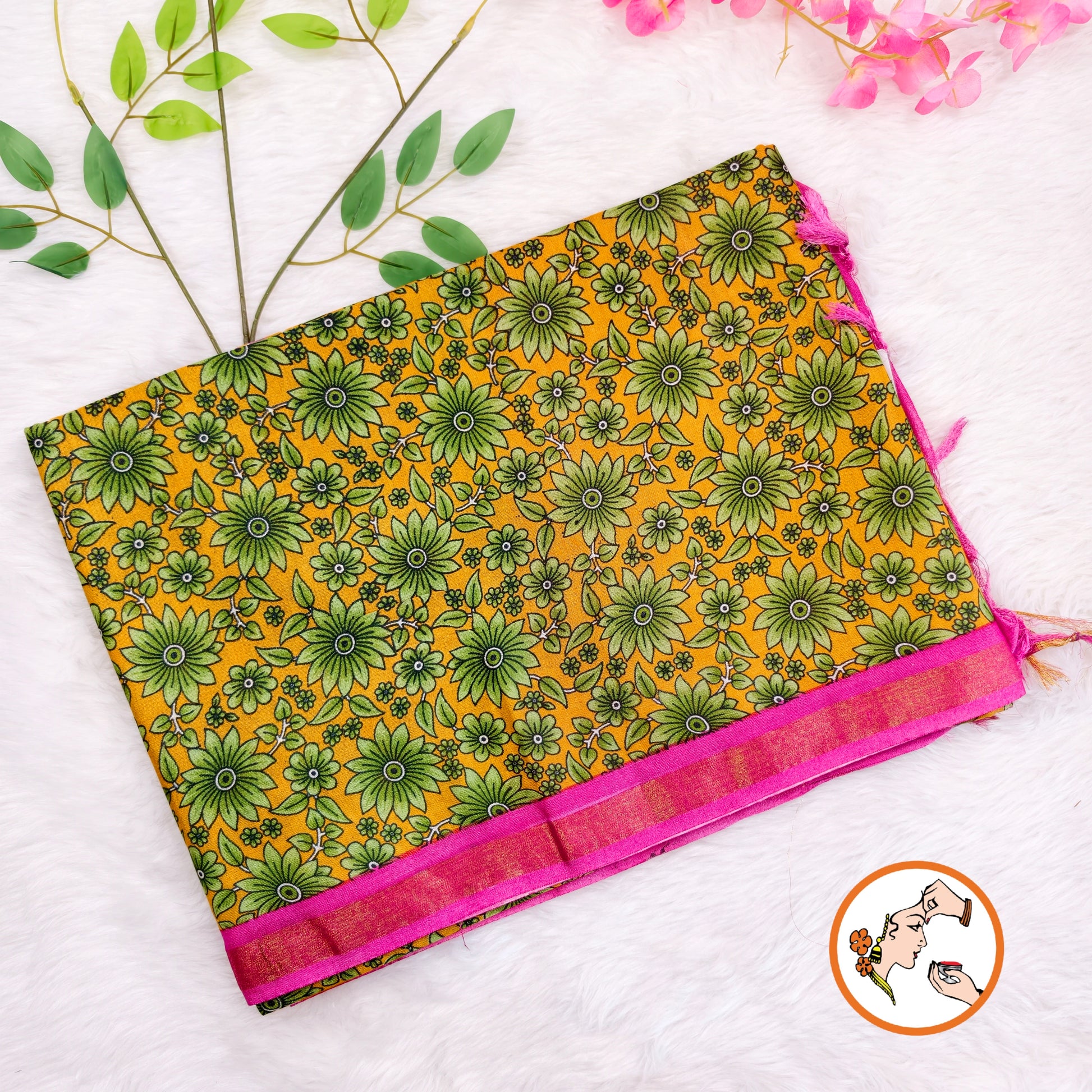 Yellow with Pink Floral Bhagal puri Cotton Casual Saree